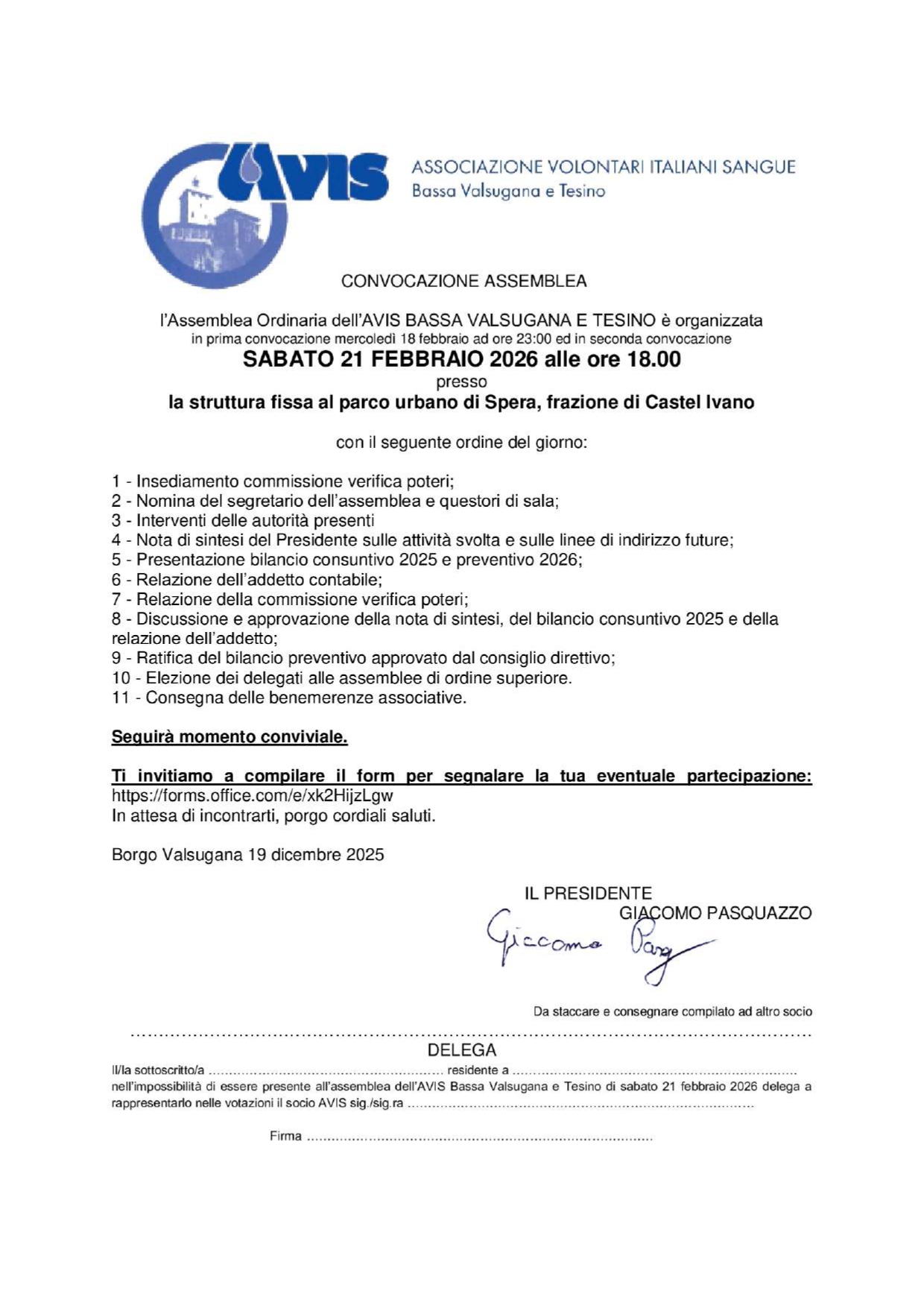 CONVOCAZIONE ASSEMBLEA AVIS BASSA VALSUGANA E TESINO – 21 FEBBRAIO 2026 ORE 18.00 –